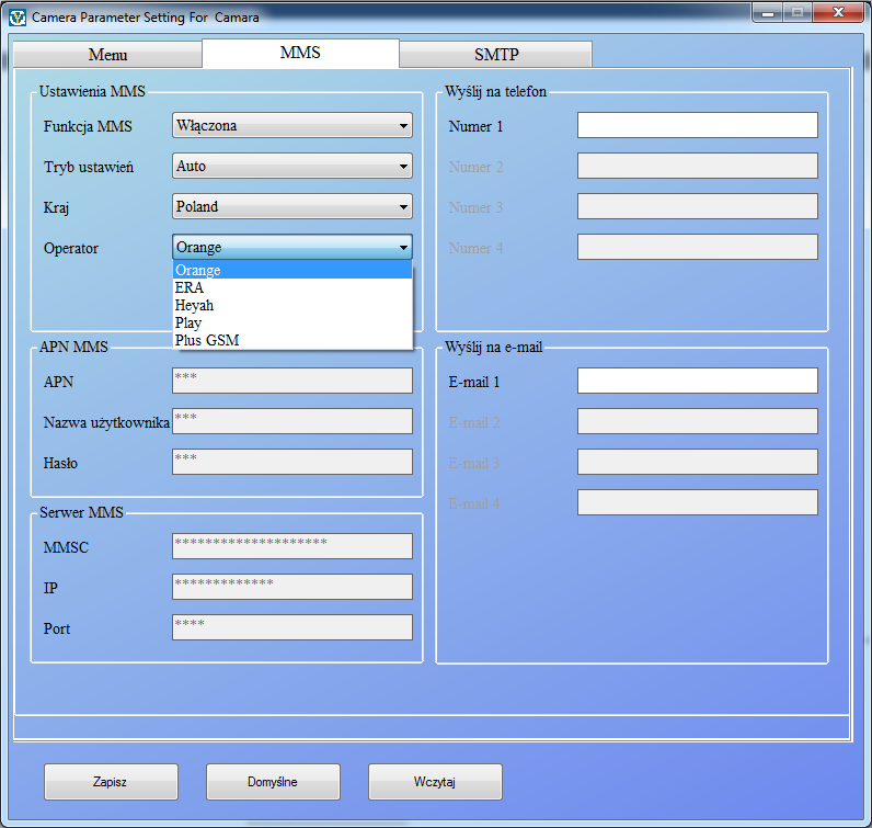Kamery HC300M moga pracową w trybie MMS lub w trybie SMTP(EMAIL) - nie ma możliwości aby kamera jednocześnie wysyłała wiadomość MMS i wiadomości EMAIL.