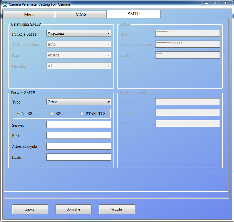 Trzecia zakładka pozwala na ustawienie kamery w tryb wysyłania maila - jest to konfguracja zaawansowana, która wymaga udostępnienia skrzynki mailowej, pośredniczącej w tym procesie.